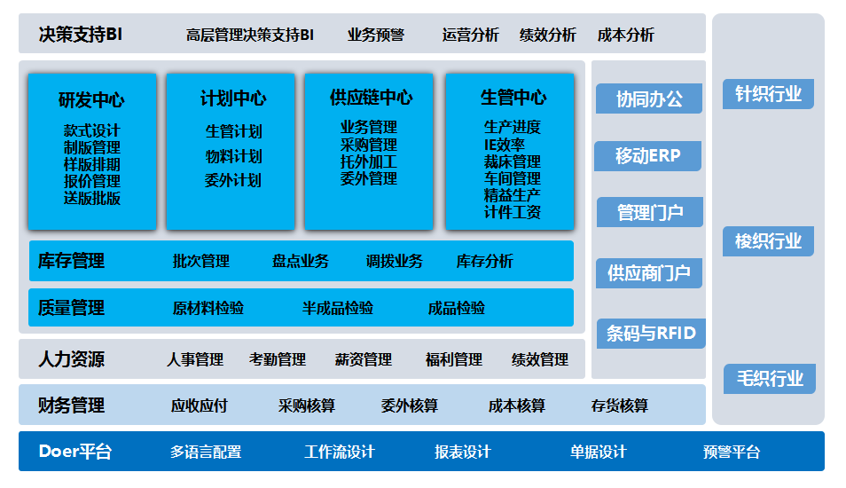 系统通过对:产前配套管理、物料控制,生产节点控制,全程的生产跟踪,高效的可视化排程,帮助企业控制物料、生产、货期进度,保证快时尚生产计划的执行。