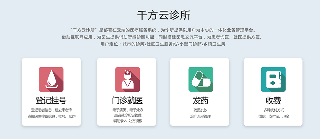 千方百剂医疗诊所版部署在云端的医疗服务SAAS,为诊所提供以用户为中心的一体化业务管理平台;为医生打造医患交流的平台,医生通过优质的诊疗服务提升自身价值;为患者提供管理自身健康档案的平台。